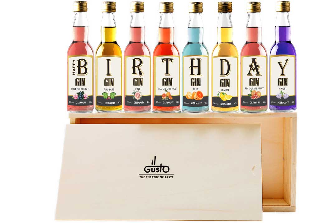 This miniature gin set is beautifully presented in a luxury wooden box – containing 8 different flavours of fruit based gin liqueurs. It is the perfect gift for a cocktail connoisseur and a great way to update your drinks cabinet. The premium gins come in a range of delicious flavours – from classic styles such as rhubarb and elderflower gin to quirky creations such as gin lime basil and pink grapefruit. Whether you choose to mix up a delicious cocktail or enjoy the smooth refined taste of a high quality gin on the rocks – these fruity flavours will bring something extra special to any occasion. Cocktail suggestions: Turkish Delight Gin & Tonic– 2 parts Turkish Delight Gin, 2 parts lemonade, 1 part prosecco and serve in a large chilled wine glass. Elderflower Gin Martini – 2 parts Elderflower Gin, 1 part fresh lemon juice, 1 tbs Dry Vermouth, 1tbs sugar syrup. Shake all ingredients with ice and pour into coupette glass straining out the ice. Gin Lime Basil Tonic – 2 parts Gin Lime Basil, 1 part fresh lemon juice, tonic water, 4 basil leaves and lemon twist to garnish. In the bottom of a cocktail glass, muddle together basil leaves and lemon juice. Add gin and stir. Fill the glass with ice, top up with tonic water, finally stir with lemon twist.