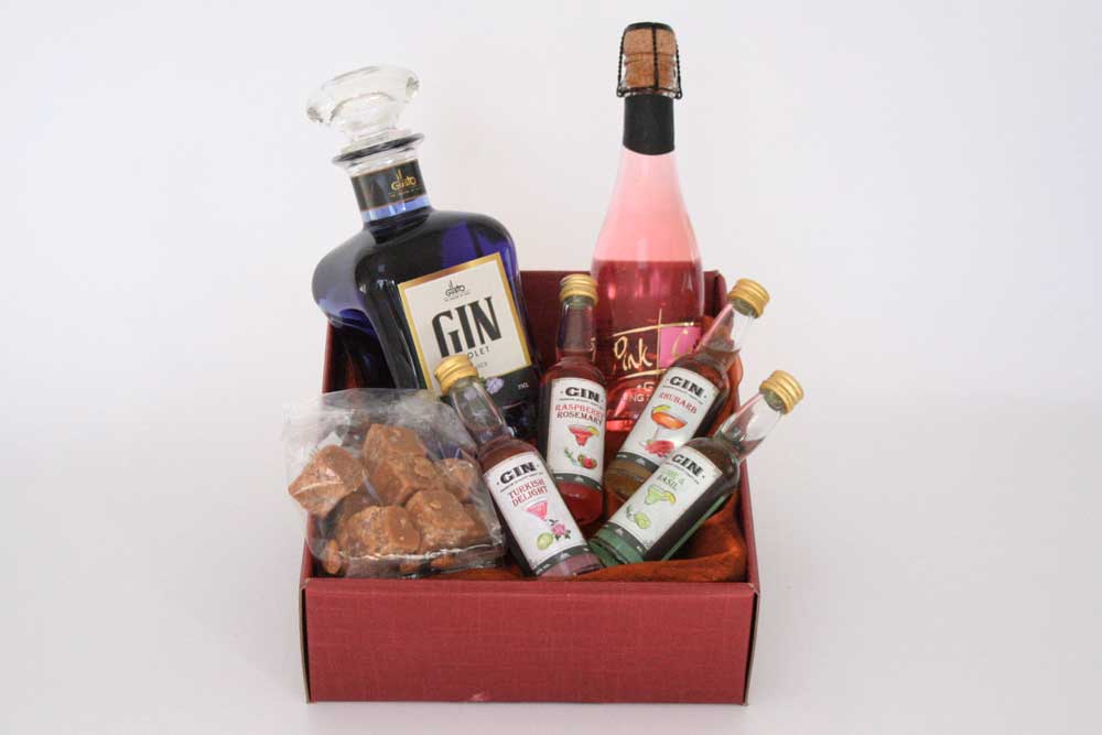 Inside this hamper you will find our Sweet Parma Violet gin in our elegant Elysee bottle, our miniature gin gift set with four delicious gins for your to try, flavours include Raspberry Rosemary Gin, Turkish Delight Gin, Lime & Basil Gin, and Rhubarb Gin. The hamper is completed with a bottle of our sparkling Pink Gin with 22 carat edible gold flakes.
