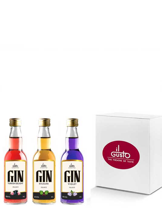 Three 20ml bottles of premium gin, containing each of the following fruity vodka liqueurs: Turkish Delight Gin (26%), Rhubarb Gin (26%), Violet Gin (26%)