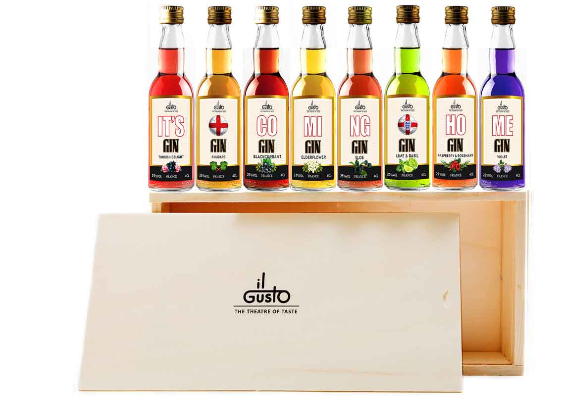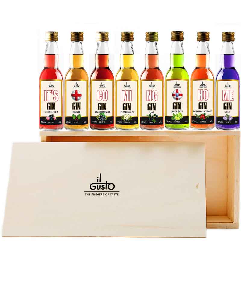 This miniature gin set is beautifully presented in a luxury wooden box – containing 8 different flavours of fruit based gin liqueurs. It is the perfect gift for a cocktail connoisseur and a great way to update your drinks cabinet. The premium gins come in a range of delicious flavours – from classic styles such as rhubarb and elderflower gin to quirky creations such as gin lime basil and pink grapefruit. Whether you choose to mix up a delicious cocktail or enjoy the smooth refined taste of a high quality gin on the rocks – these fruity flavours will bring something extra special to any occasion. Cocktail suggestions: Turkish Delight Gin & Tonic– 2 parts Turkish Delight Gin, 2 parts lemonade, 1 part prosecco and serve in a large chilled wine glass. Elderflower Gin Martini – 2 parts Elderflower Gin, 1 part fresh lemon juice, 1 tbs Dry Vermouth, 1tbs sugar syrup. Shake all ingredients with ice and pour into coupette glass straining out the ice. Gin Lime Basil Tonic – 2 parts Gin Lime Basil, 1 part fresh lemon juice, tonic water, 4 basil leaves and lemon twist to garnish. In the bottom of a cocktail glass, muddle together basil leaves and lemon juice. Add gin and stir. Fill the glass with ice, top up with tonic water, finally stir with lemon twist.
