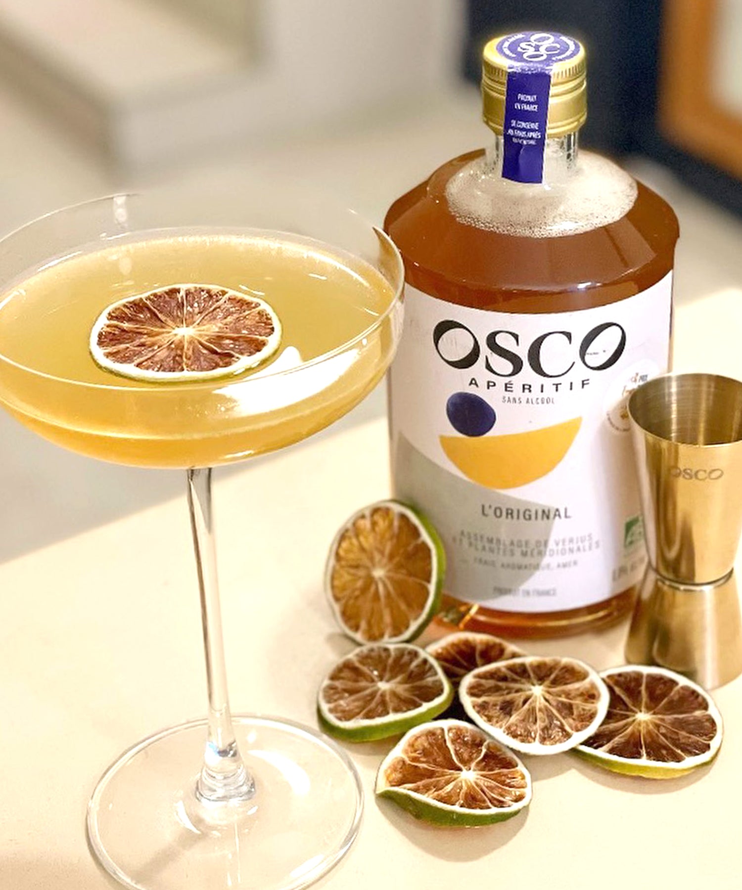 An aperitif is a blend of wine and plants. At OSCO, our non-alcoholic aperitifs use this structure by replacing the wine with verjuice: the juice of green grapes harvested before maturity. Same origin, same character, minus the alcohol!