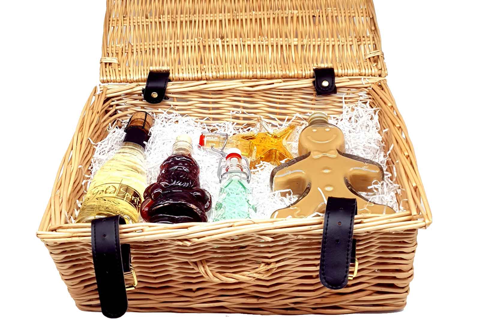 In this charming basket, you will find some of our high quality spirits and liqueurs including our Sparkling Gold Cuvee 200ml, Sour Cherry Vodka in a Santa bottle 100ml, our handcrafted Lime Basil Gin in our popular Christmas Tree shaped bottle 40ml, our Amaretto in a Star bottle 40ml and finally our delicious Gingerbread Liqueur in a Gingerbread Man bottle 250ml.
